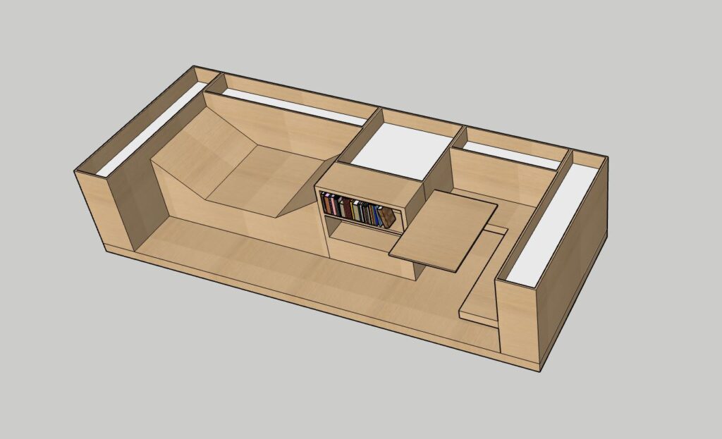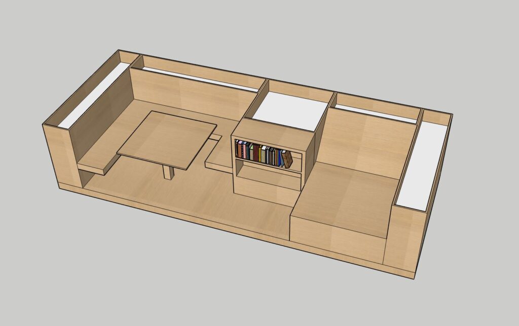 Variante 3: Sitzbereich mit Tisch, Büchertauschregal, einzelner Liegefläche und Pflanzbeeten