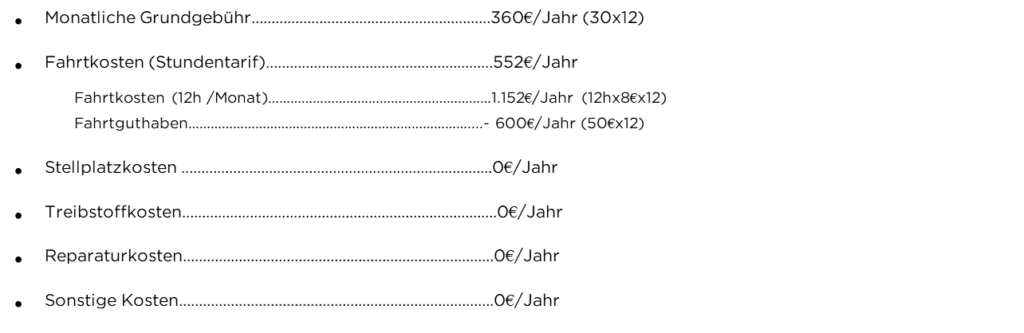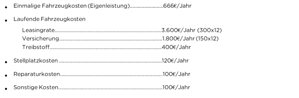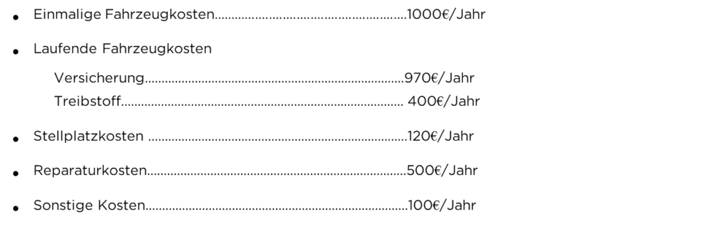 Hier eine kurze Übersicht mit welchen Fahrzeugkosten du bei diesen drei Varianten rechnen kannst:
