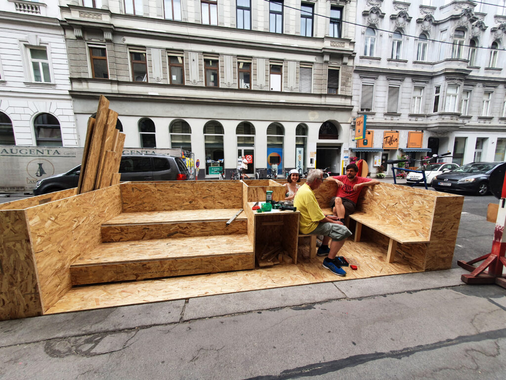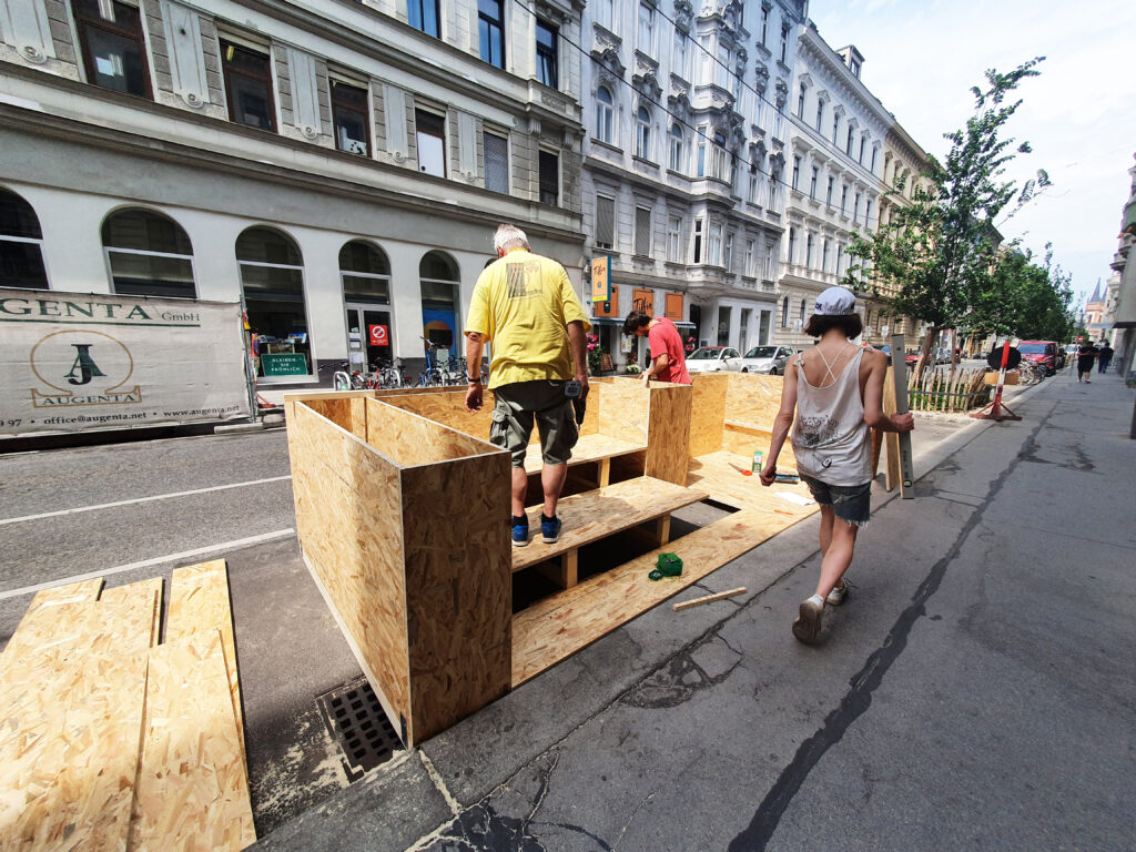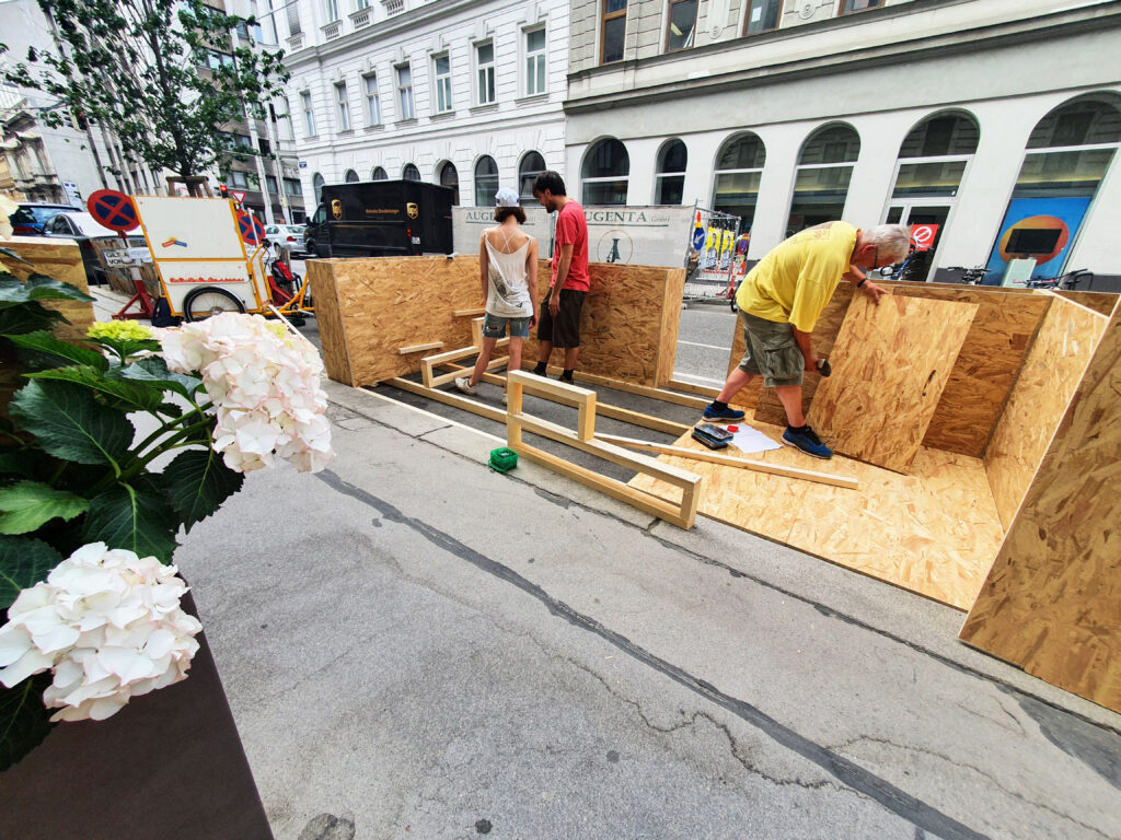 Am 20. und 21. Juni war es endlich soweit! Wir haben gemeinsam mit einer engagierten Anrainerin aus dem 7. (vielen Dank an dieser Stelle für deine tatkräftige Unterstützung!) die Mo.Hub Aufenthaltsoase gebaut. Mit Getränken aus dem Haus 48A wurden wir ebenfalls versorgt, danke auch an dieser Stelle. Ein paar Impressionen folgen …