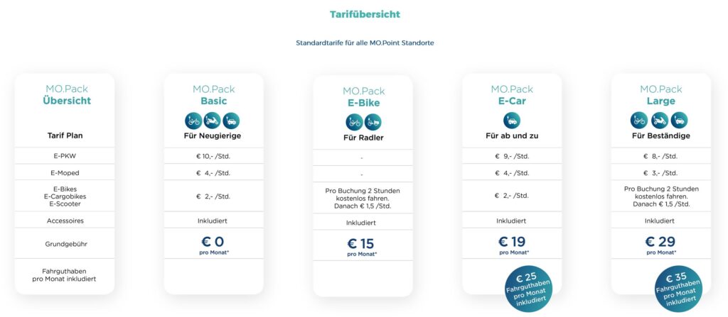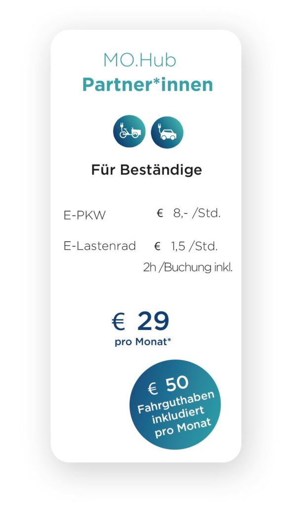 MO.Point bietet verschiedene Tarife für unterschiedliche Nutzer*innen an. Mo.Hub-Partner*innen fahren jedoch zu einem besonderen Tarif und speziellen Konditionen: Dem MO.Hub Partner*innen Tarif um 29 € im Monat. Das beinhaltet: